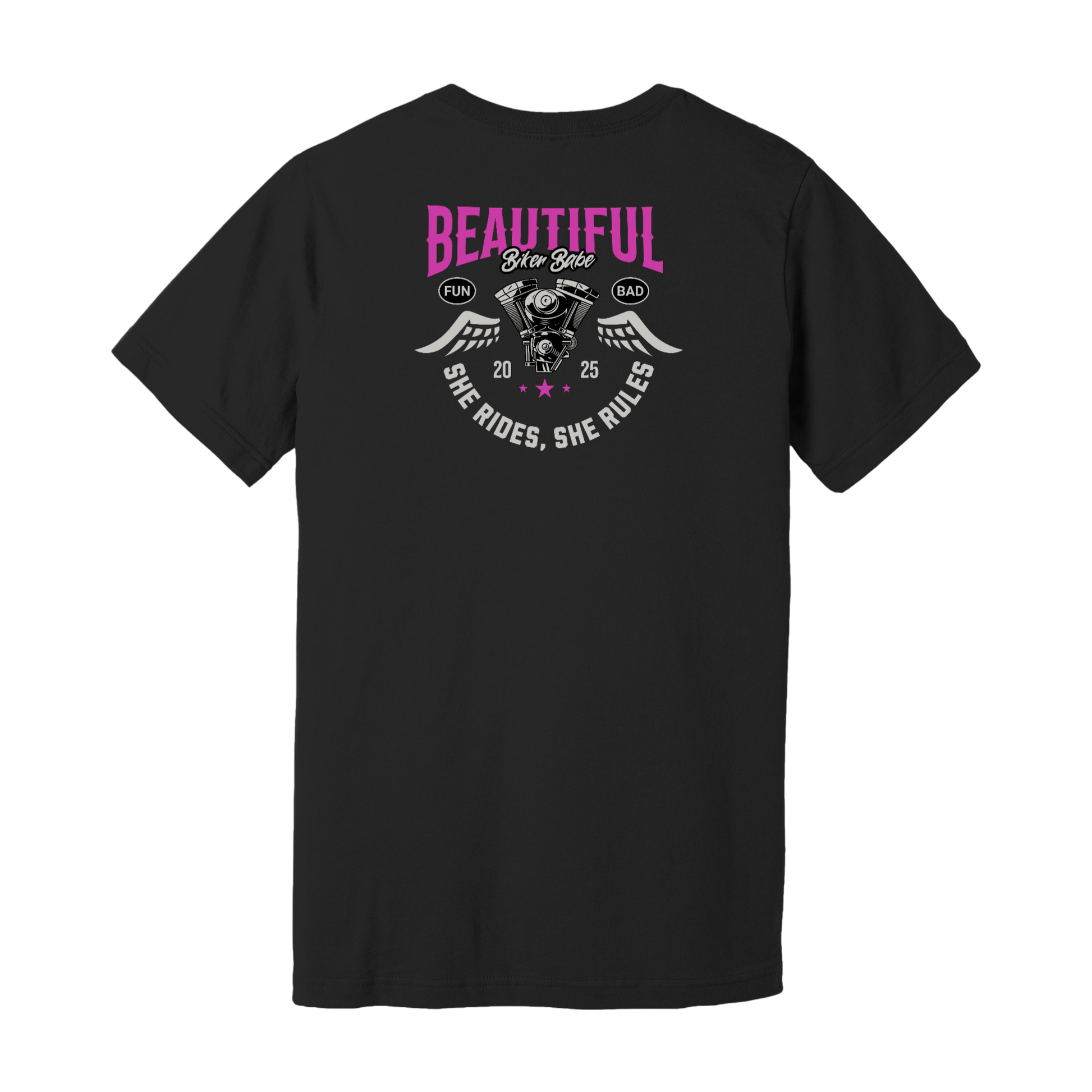 Unleash your inner rebel with the "She Rides, She Rules - Beautiful Biker Babe Tee" from Throttle Glory Clothing. Celebrate the fearless spirit of every woman who takes the throttle with a design that's as bold as it is empowering. This striking tee features the iconic phrase "BEAUTIFUL BIKER BABE" in vibrant pink letters, accented by a classic motorcycle engine and angelic wings, symbolizing the freedom and thrill of the ride. The additional tags "FUN" and "BAD" capture the essence of a biker’s dual nature—playful yet daring. Perfect for the lady who dominates the roads and sets her own rules, this t-shirt is a testament to strength, beauty, and unapologetic individuality. Make a statement wherever you go: ride hard, live free, and look fabulous doing it!
